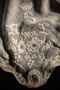 Ricamo riportato su bisso di lino cucito ad ago; ricamo:punto pieno, punto nodini francesi, punto cordoncino, punto festone; inserti ad ago.